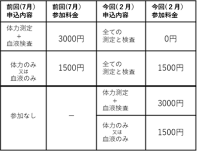| 2月17日(火) | 松本短期大学(笹賀3118) | 9:20~ 9:50 | 血液検査 + 体力測定 |